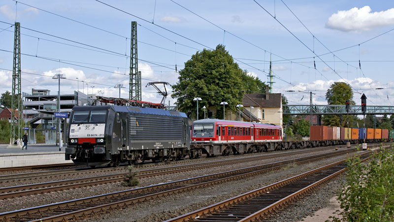 Noch mehr Container mit der schwarzen ES 64 F4-211 der MRCEdispolok. Buchholz (i.d.Nordheide), 3. September 2010 |