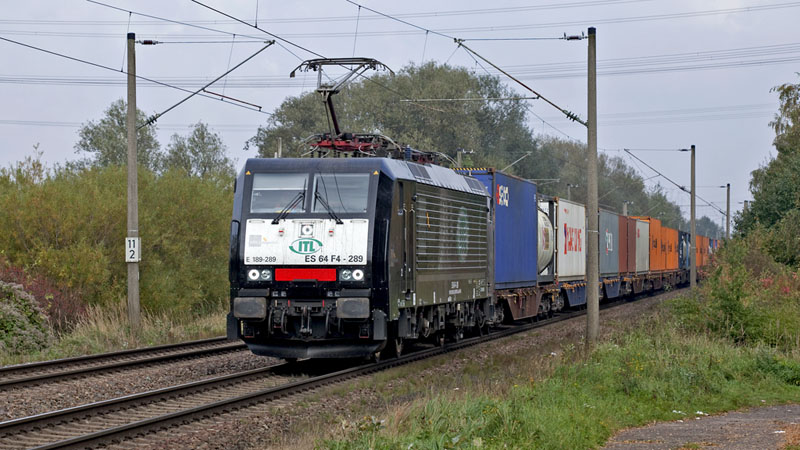 Einen weiteren schweren Containerzug hatte die schwarze ES 64 F4-289 der ITL am Haken. Hamburg-Moorburg, 10. Oktober 2010 |