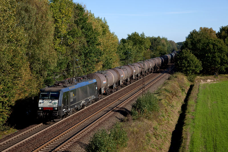 Einen langen Kesselwagenzug nach Hamburg hatte die ES 64 F4-210 der ITL am Haken. Grevelau, 15. Oktober 2011 |