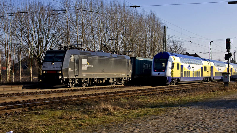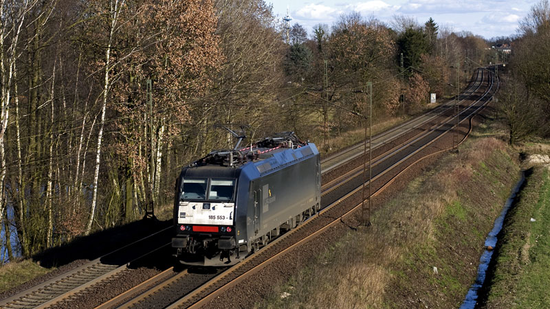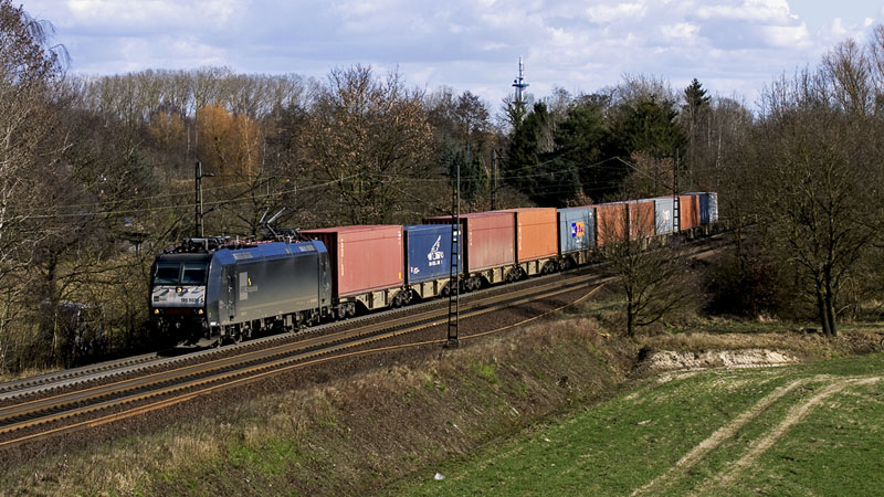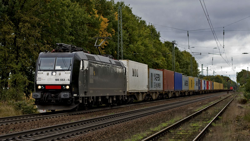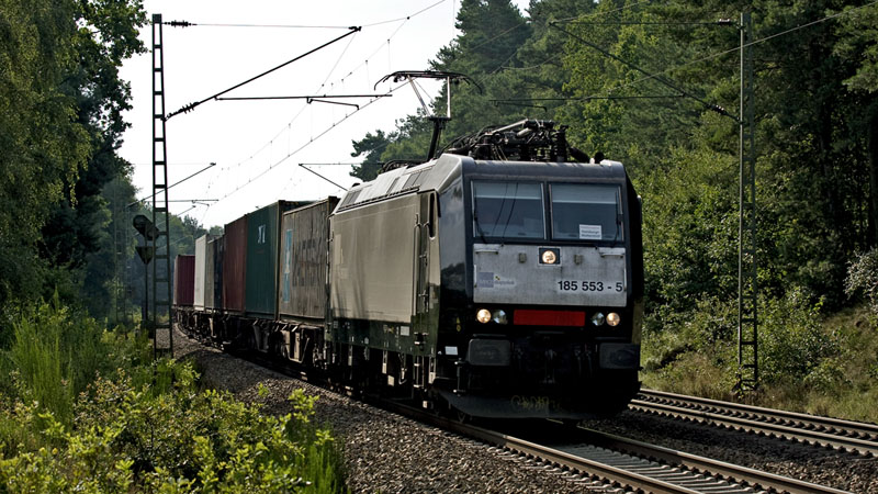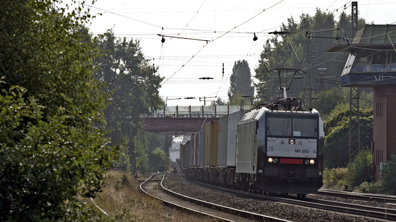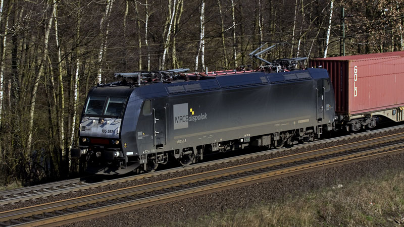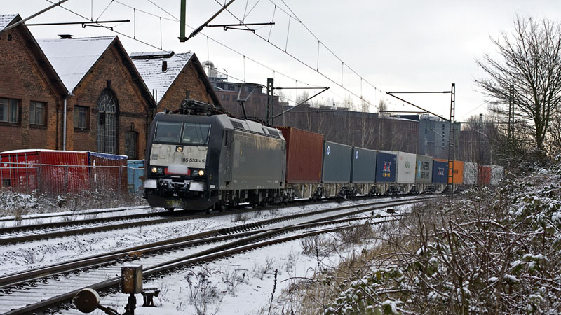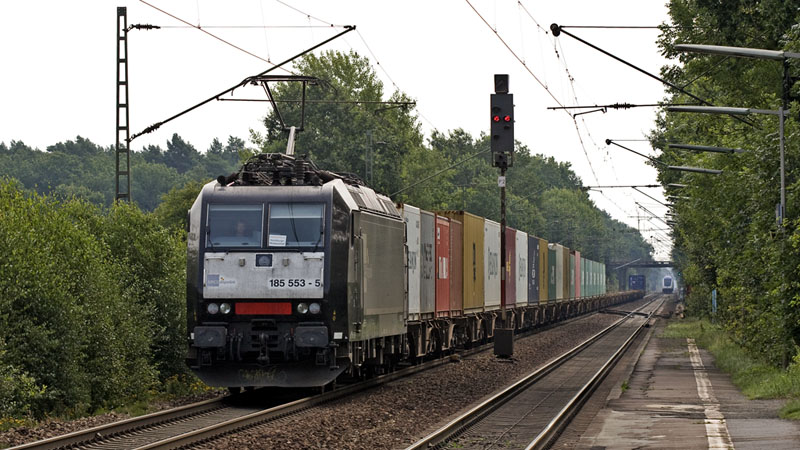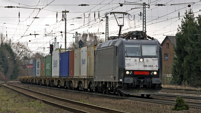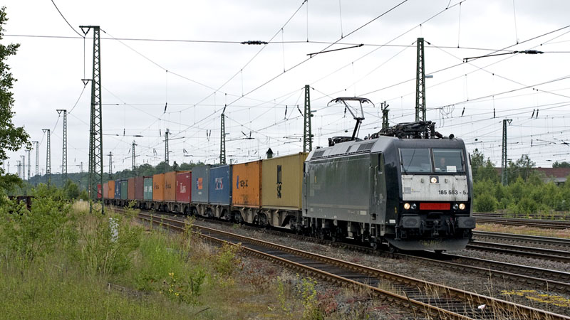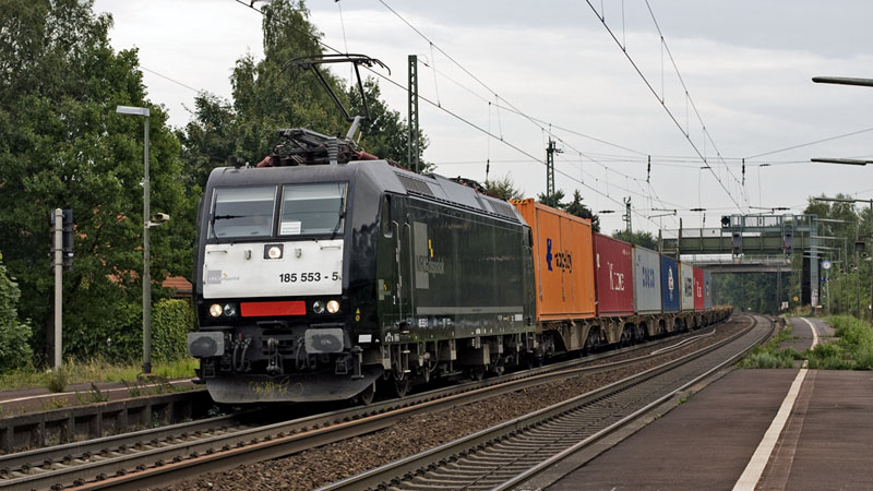 185 553-5 der MRCEdispolok mit ihrem LOCON-Containerzug nach Hamburg.