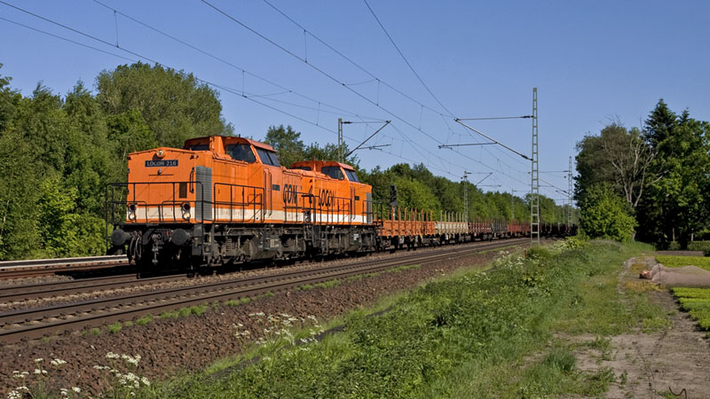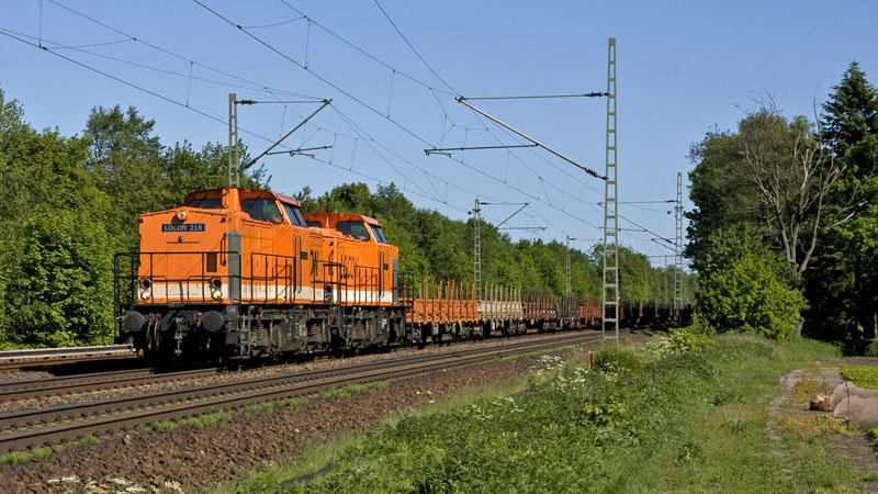 … LOCON 216 und LOCON 215 brachten einen langen Rungenwagenganzzug in den Norden.