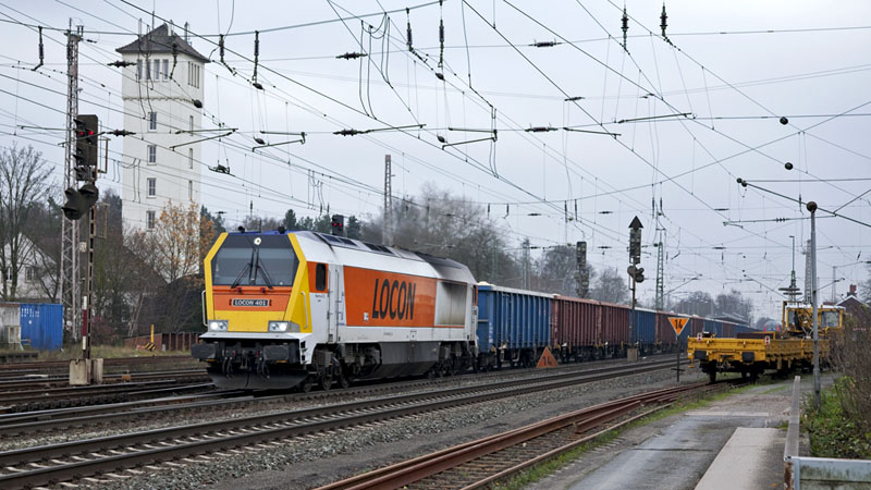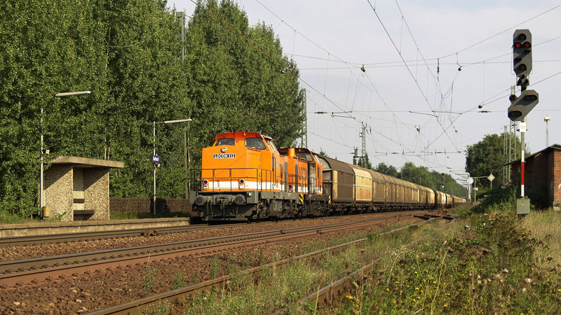 Mit einem schweren Sandzug aus Ea-Wagen brüllte die LOCON MAXIMA 401 durch den Bahnhof!