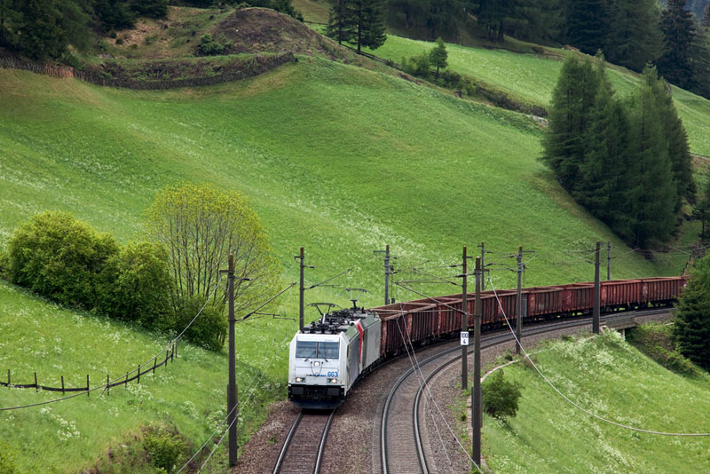 Die 185 665 und 186 105 vor einem gemischten Güterzug nach Brennero.