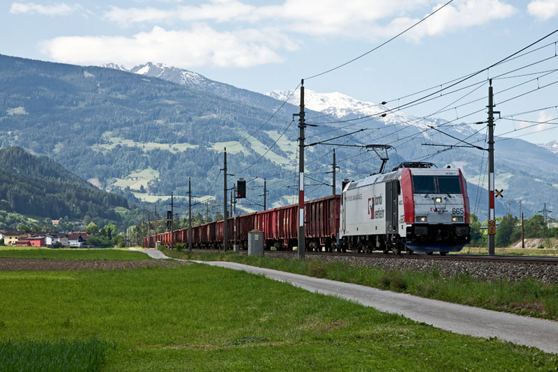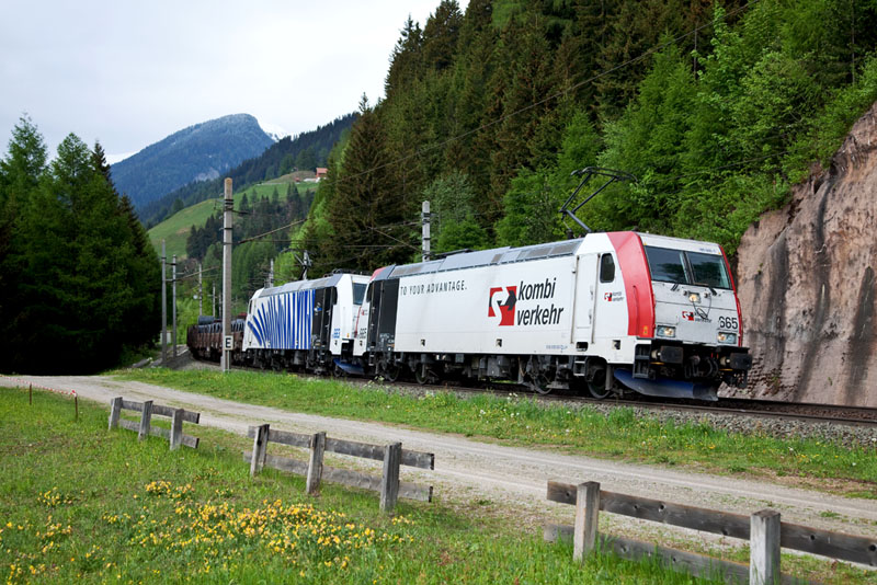 Die Lokomotion 185 665 und 185 663 fuhren mit einem Stahlzug den Berg hinauf.