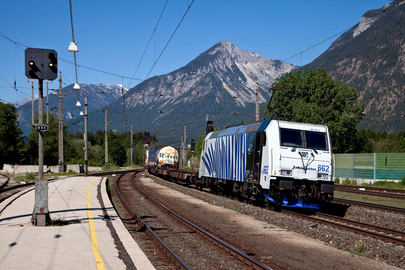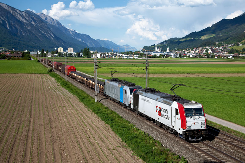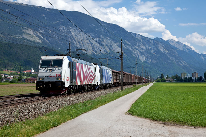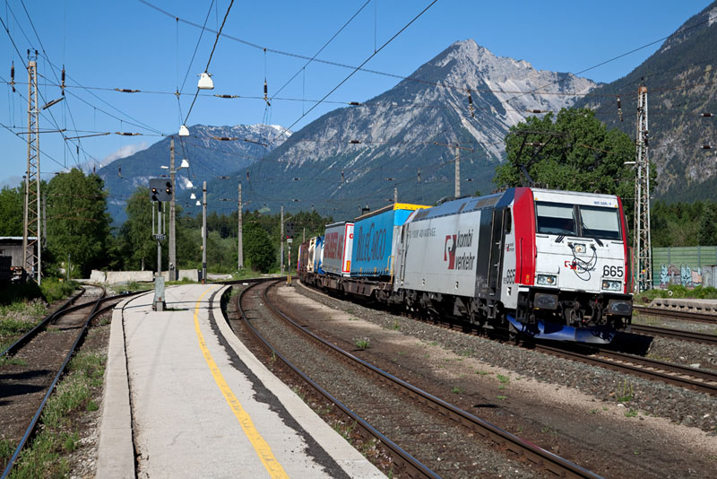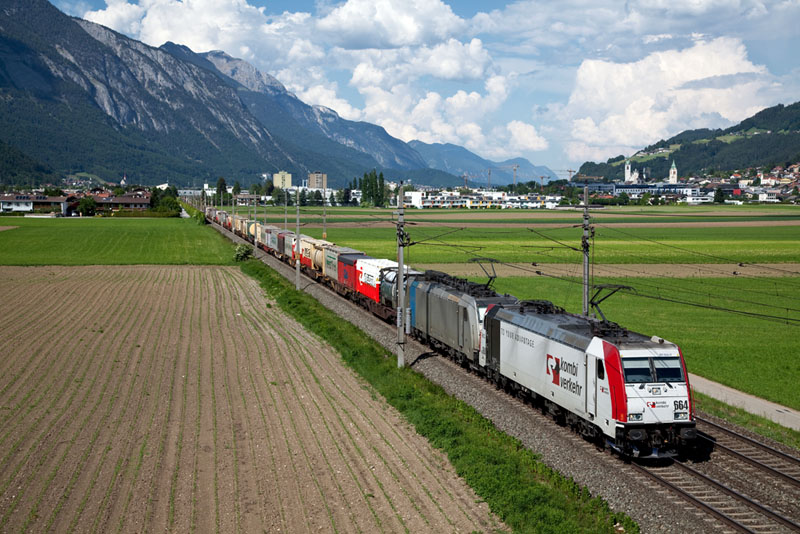Durch das Inntal rauschten 185 664 und 186 110 vor einem KLV-Zug nach Italien.