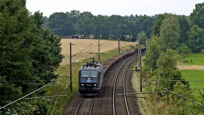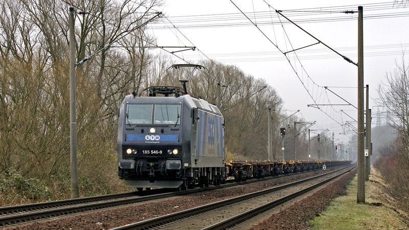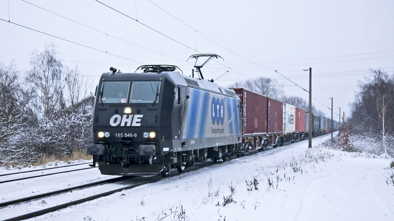 185 546-9 der OHE-Tochter LTH brachte einen langen Containertragwagenzug