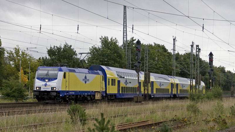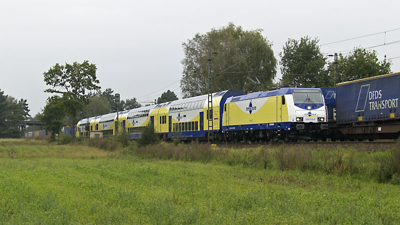abbremsend hielt der MEr nach Lüneburg mit der 146 533-5. Radbruch, 12. September 2009 |