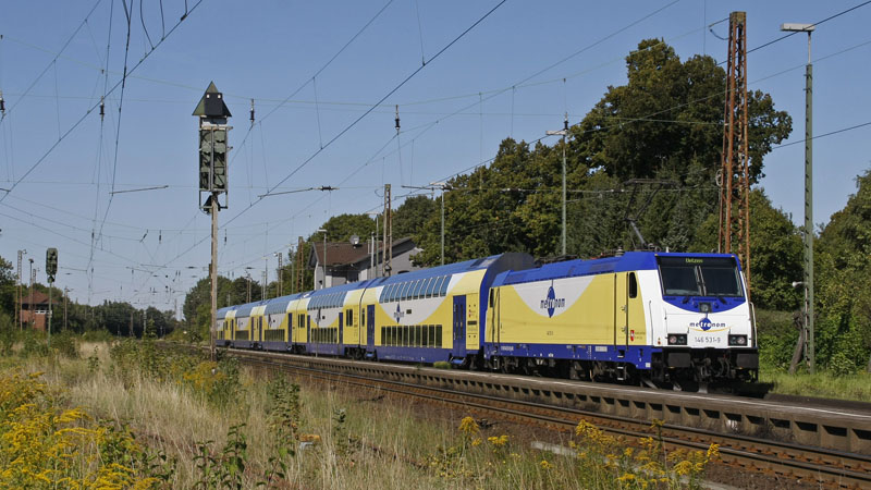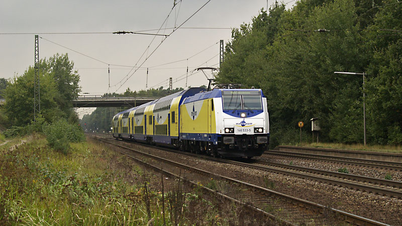 metronom-Durchläufer nach Hannover mit der 146 531-9. Meckelfeld, 24. Juli 2008 |