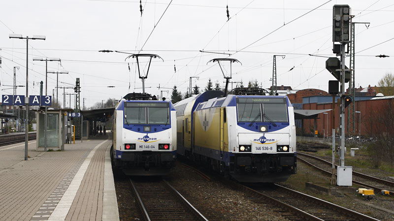 Während die ME 146-04 mit ihrem metronom nach Hamburg auf die Überholung durch einen ICE wartete, fuhr nebenan die 146 536-8 mit einem Sonderzug an ihr vorbei. Lüneburg, 20. April 2008 | ||