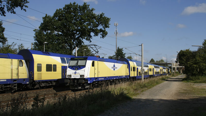 zeitgleich hielt der Gegenzug mit der 146 533-5 nach Hamburg Harburg. Klecken, 7. September 2008 |