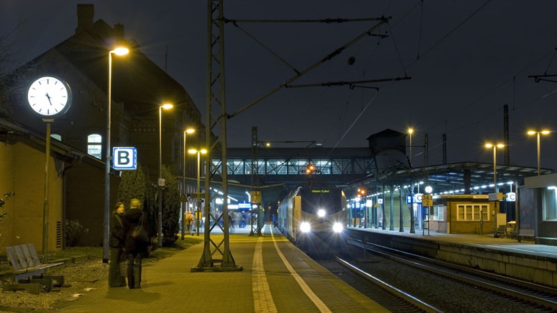Bevor die Sonne unterging, gab es nochmal Streiflicht – hier mit dem MEr nach Lüneburg mit der 146 533-5. Ochtmissen, 21. November 2009 |