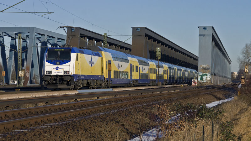 146 533-5 mit dem metronom zum Hamburger Hbf. Hamburg Süderelbbrücken, 2. Januar 2009 |