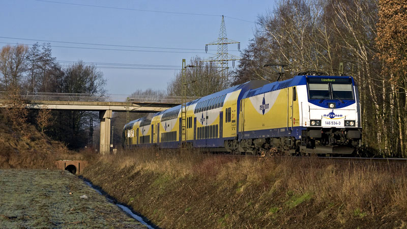 Die 146 534-3 mit ihrem achtteiligen metronom ME 80943 nach Uelzen. Radbruch, 9. Januar 2010 |