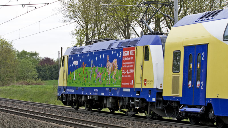 Auf Präsentationsfahrt war die 146 535-0 mit der Werbebeklebung für den amerikanischen Künstler James Rizzi. Klecken, 20. Mai 2010 |