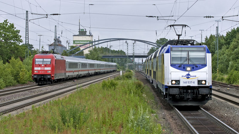Einfahrt für den MEr mit der 146 537-6, während die 101 027-1 mit ihrem IC 2311 vorbeidonnerte. Tostedt, 20. Juni 2010 |
