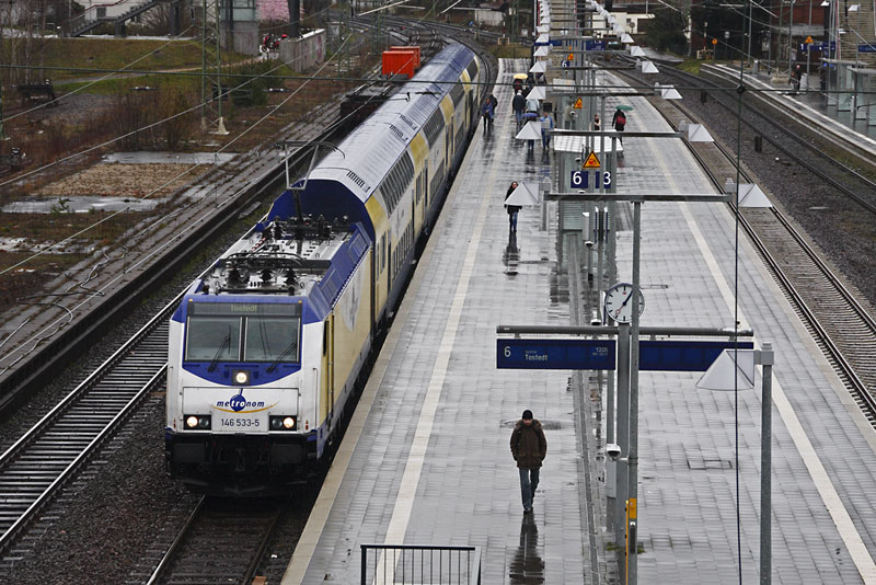 Ein ausfahrender metronom Regional nach Tostedt mit der 146 533-5. Hamburg-Harburg, 10. März 2010 |