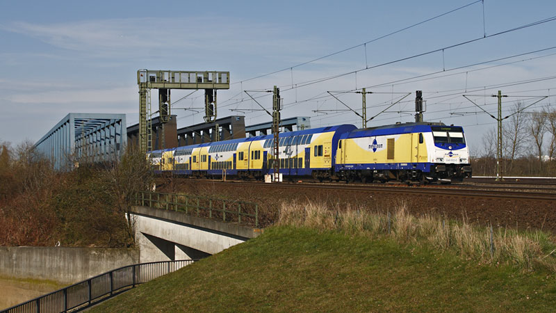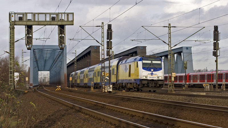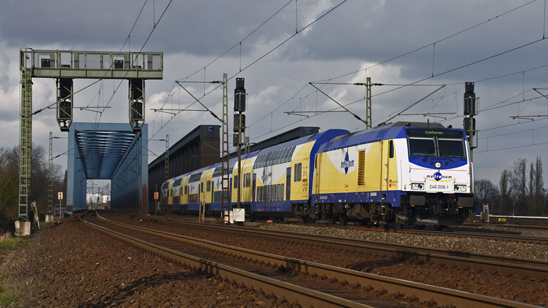 Der Diesel-metronom nach Cuxhaven mit der 246 003-8. Hamburg Süderelbbrücken, 6. März 2010 |