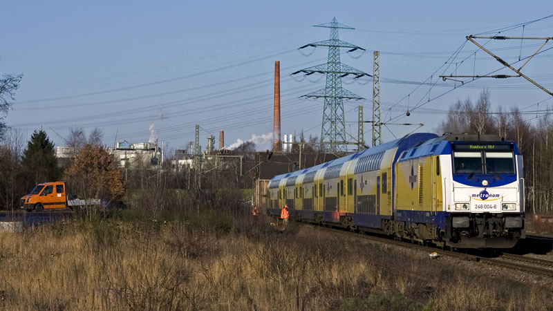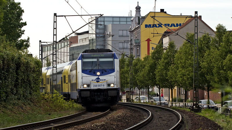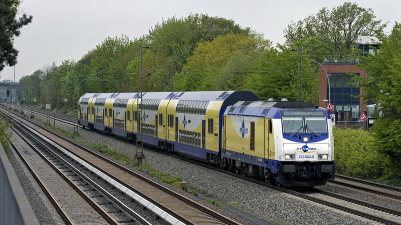 Der heutige moderne "Eilzug" der Unterelbebahn von Cuxhaven: der metronom mit der 246 004-6. Hamburg-Hausbruch, 8. Mai 2010 |