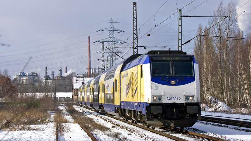 IGT-eigene TRAXX-DE Diesellok 246 001-2 mit einem metronom an die Nordsee. Hamburg-Unterelbe, 14. Februar 2009 |