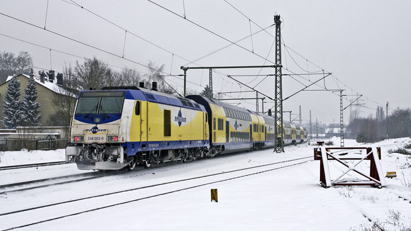Der metronom von Cuxhaven mit der Diesellok 246 002-0. Hamburg-Harburg, 17. Januar 2010 |