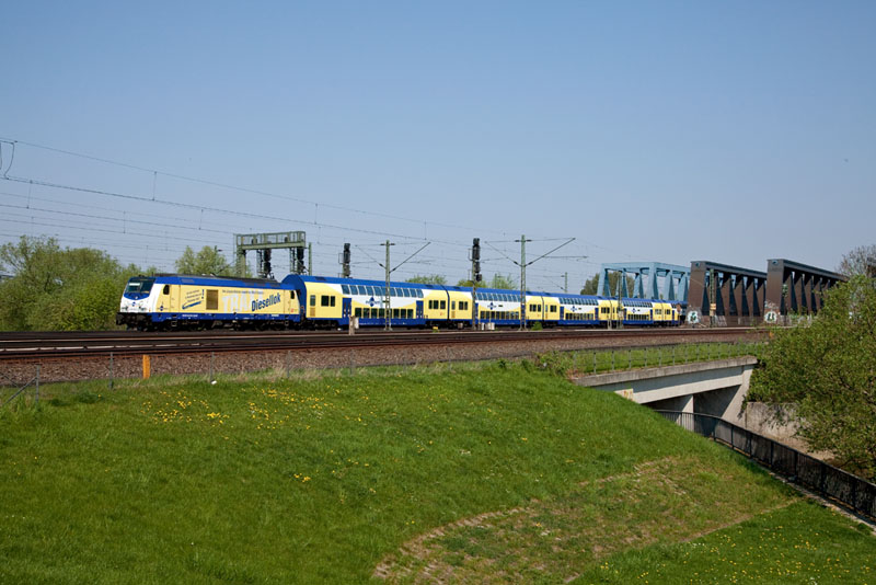 Und nun der metronom nach Cuxhaven mit der IGT TRAXX DE-Werbelok 246 001-2. Hamburg Süderelbbrücken, 25. April 2011 |