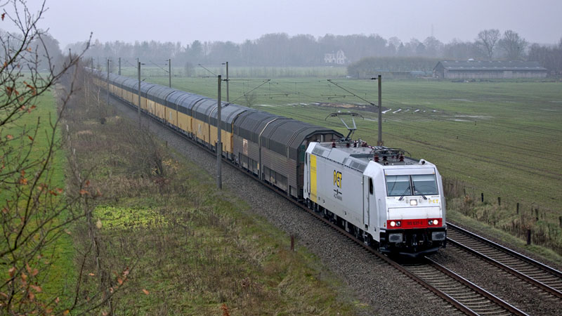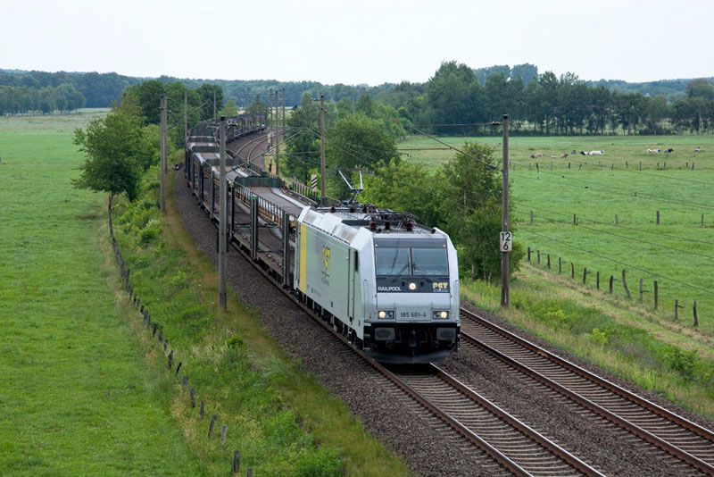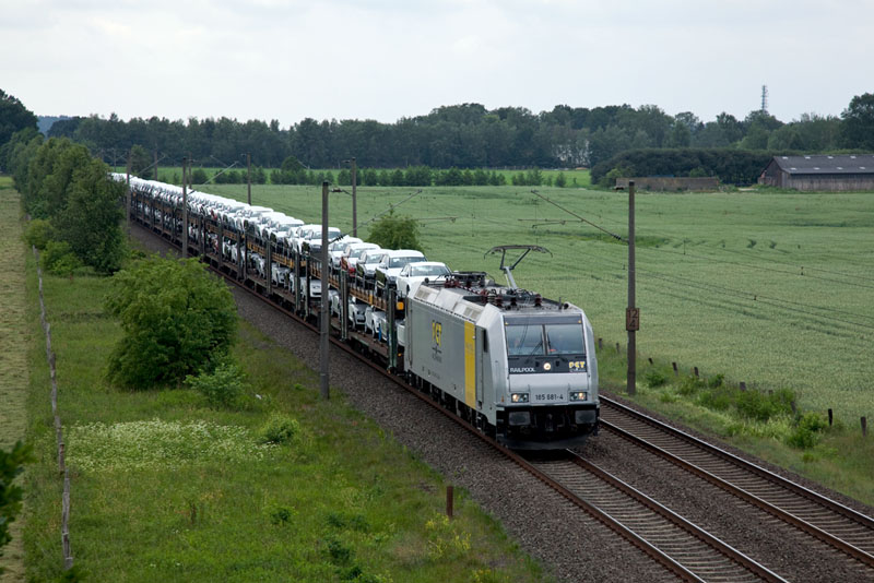 Die Railpool-Lok 185 681-4 im Einsatz für die ARS Altmann-Gruppe mit einem Autologistikzug nach Cuxhaven.