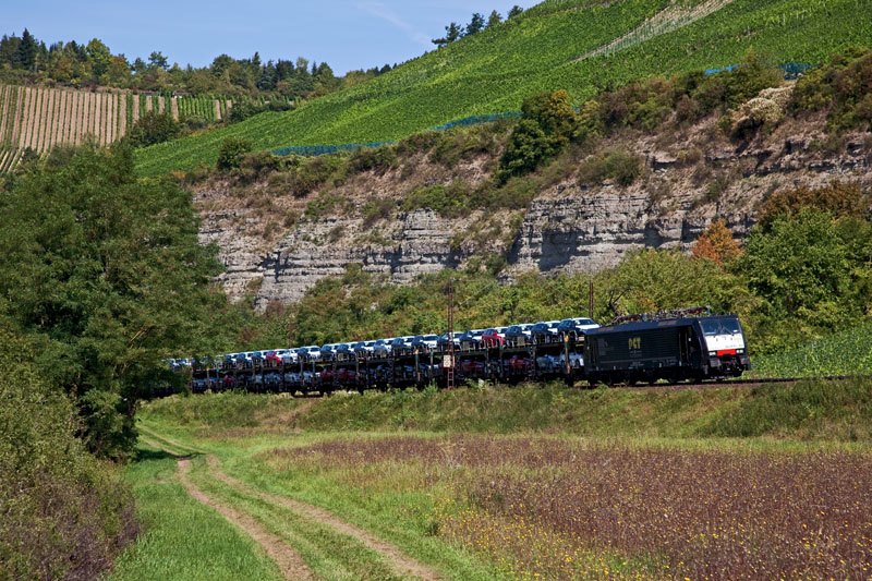 Für eine kurze Zeit war die SIEMENS-Jubiläumslok ES 64 F4-150 an die TX Logistik vermietet, so hier vor einem ARS Altmann-Autologistikzug. Karlstadt, 31. August 2011 |