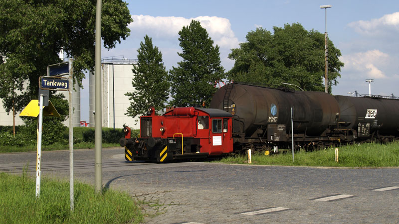 Köf 1 mit ein paar Kesselwagen über die paar Straßenübergänge.