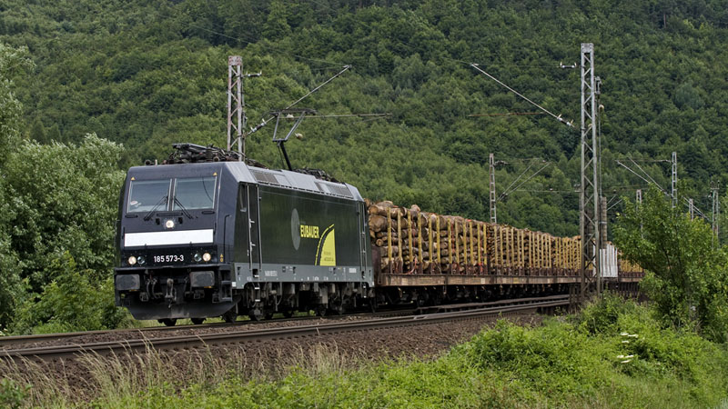 Die an Alexander Neubauer vermietete 185 573-3 kam mit dem Holzzug DGS 95011 Marburg - Niedergörne.