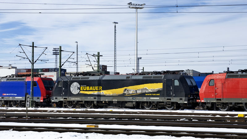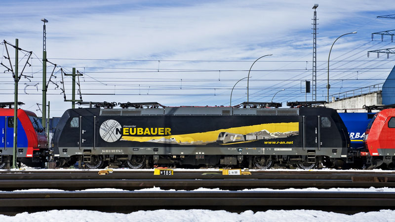 Die 185 574-1 von Railservice Alexander Neubauer mit der interessanten Beklebung.
