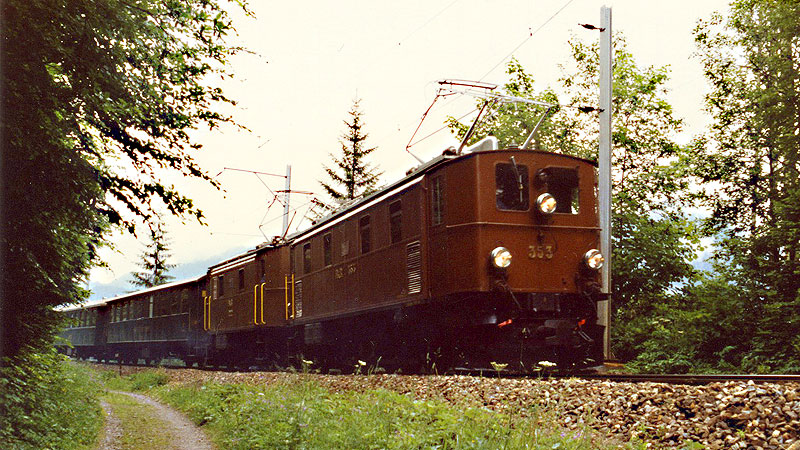 Die Ge 4/6 353 und eine Ge 2/4 kurbeln gemeinsam mit einem Sonderzug die Steigung von Davos Dorf nach Klosters hinab. Sommer 1989 | ||