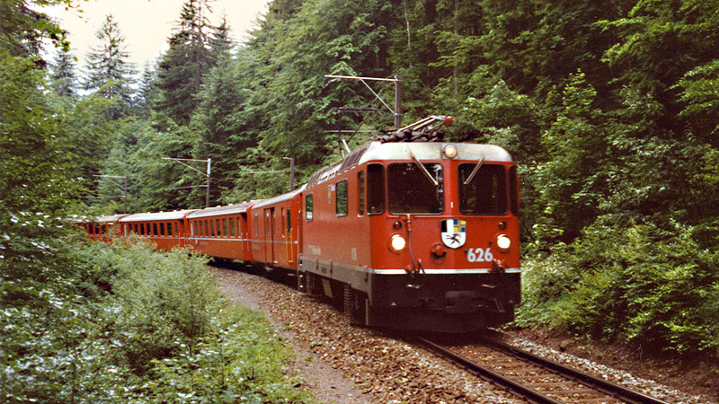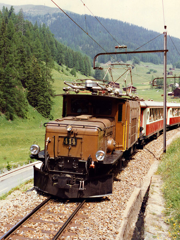In flotter Fahrt bringt die Ge 4/2 II 626 einen Regionalzug von Davos über Klosters nach Landquart – kurz vor dem Kehrtunnel bei Klosters. Sommer 1989 | ||
