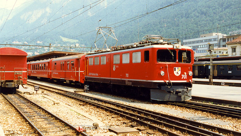 Im meterspurigen Teil des Hauptbahnhofes von Chur steht die Ge 6/6 II 701 mit einem Glacier-Express nach Zermatt und wartet auf die Fahrtfreigabe. Sommer 1989 | ||