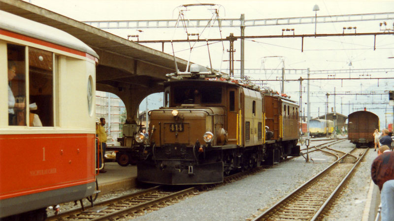 Das Rhätische Krokodil Ge 6/6 I 414 und die Ge 4/6 353 setzen sich in Davos-Platz an den Salonwagenzug, um gleich mit ihm als Sonderfahrt nach Filisur zu fahren. Sommer 1989 | ||