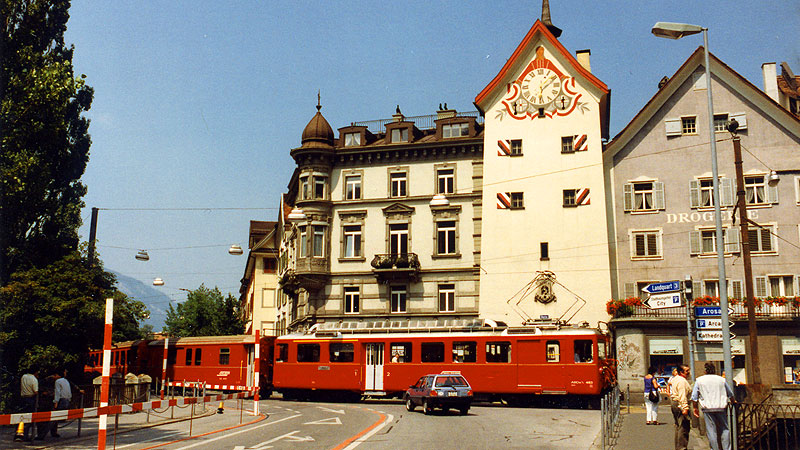 Wenig später durchfährt dieser Zug die Altstadt von Chur. Alle Autos müssen zur Seite fahren bzw. gebührend Abstand nehmen. Sommer 1989 | ||