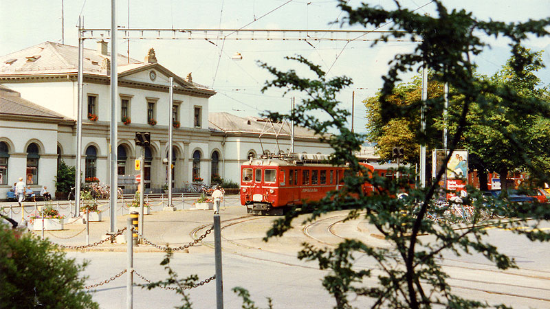 Auf dem Bahnhofsvorplatz von Chur beginnt die Chur-Arosa-Bahn der Rhätischen Bahn, die damals noch mit Gleichstrom betrieben wurde. Triebwagen 848 wartet auf die Abfahrt. Sommer 1989 | ||