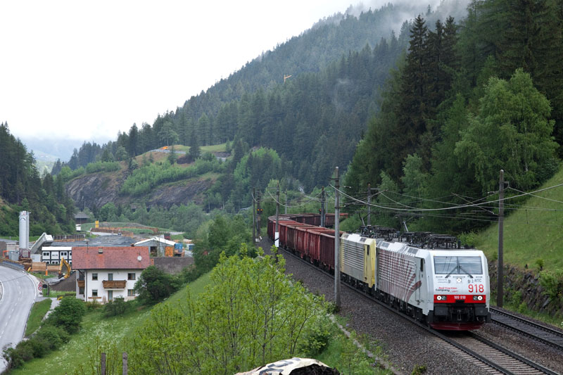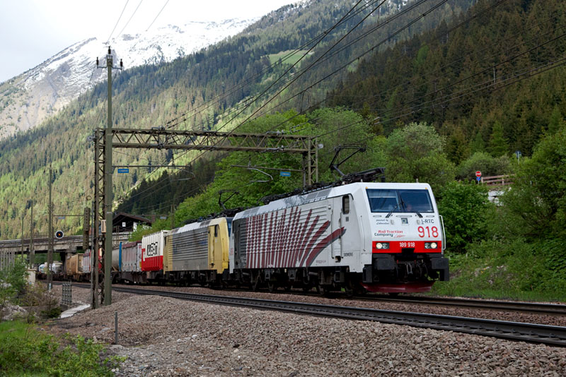Hurra, das RTC-Zebra! Die 189 918 in Traktion mit 189 901 vor einem langen Ea-Wagenzug nach Italien.