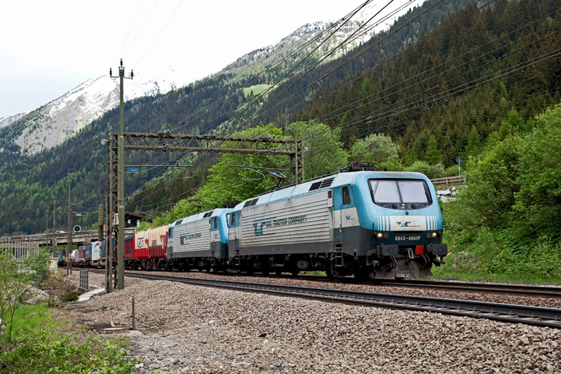 Die Rail Traction Company in Form der EU43 004RT vor einem KLV-Zug.