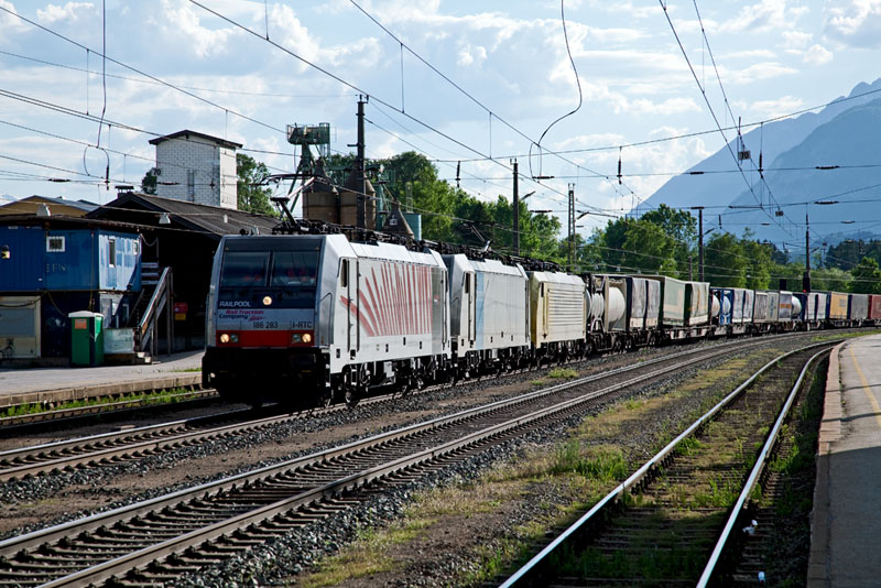 Von Kufstein kam dieser KLV-Zug mit den Railpool-Zebras 186 282 und 186 285 der RTC.