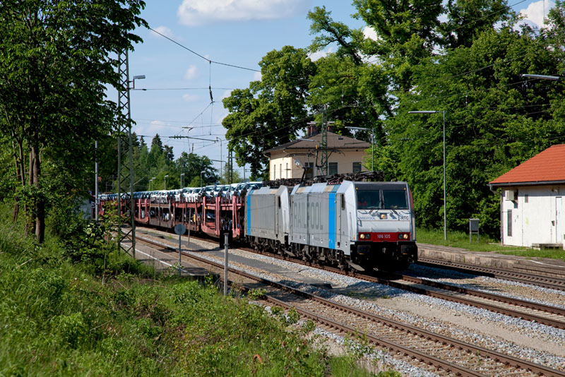 Die Rail Traction Company-Loks 186 106 und 186 282 standen mit ihrem Autologistikzug und warteten auf die Ausfahrt.
