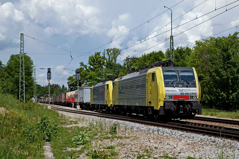 Die 189 905 und 189 907 der RTC mit einem KLV-Zug auf dem Weg in den Süden.