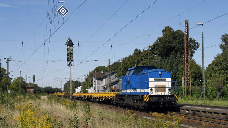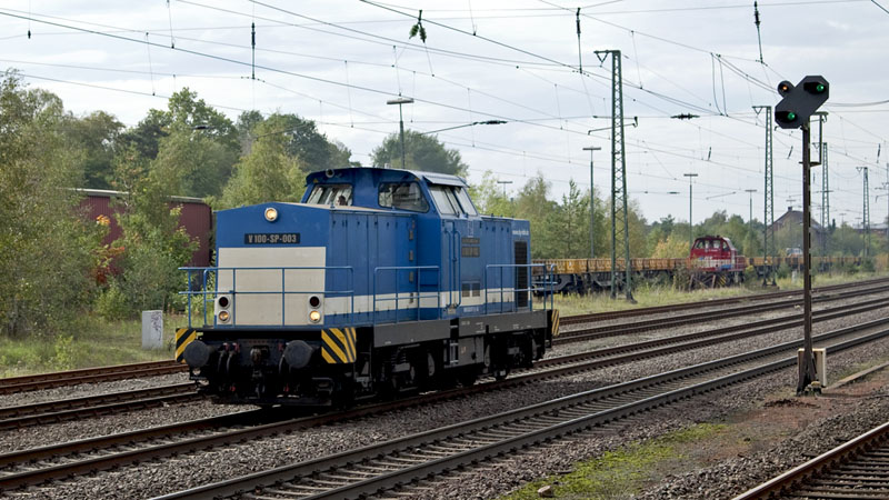 Die V 100-SP-003 der Baulogistikfirma SPITZKE auf dem Weg nach Maschen.