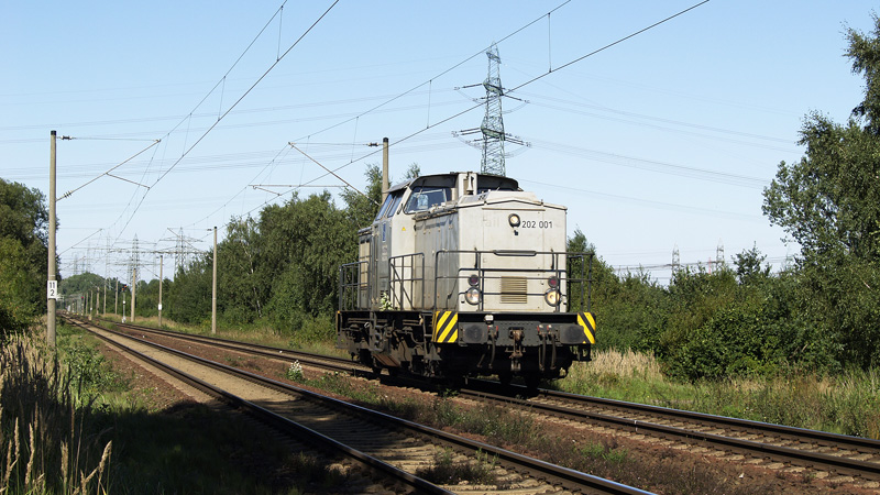 silberne Spitzke V100 Ost, die 202 001, rollt als Lokzug von Hamburg-Hausbruch
