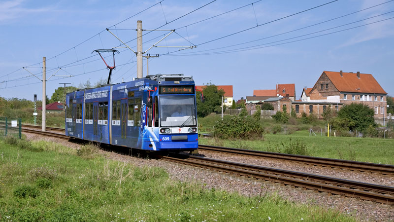 Der Galileo-Werbetriebwagen 609 fuhr auf der Halleschen Überlandstrecke nach Bad Dürrenberg.