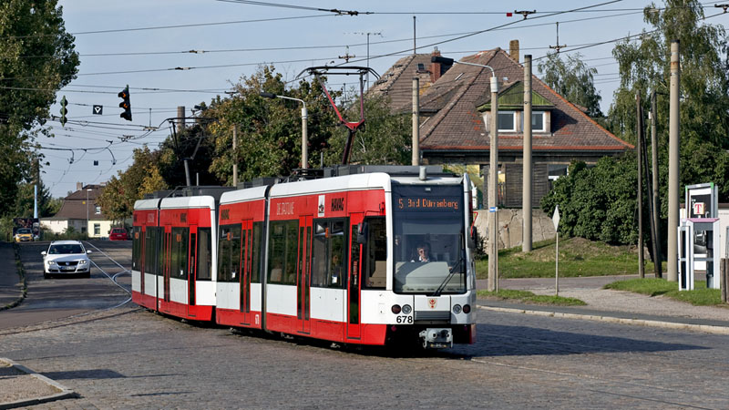 An der Abzweigung der Linie 15 am Leunaweg hielt die 678+677-Traktion auf der Linie 5 nach Bad Dürrenberg.
