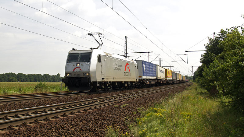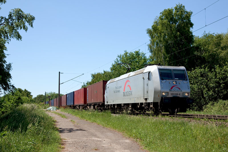 Die saubere 185 538-6 der TX Logistik mit einem Containerzug. Radbruch, 10. Juli 2010 |