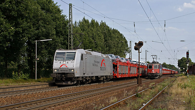Die 185 537-8 der TXL brachte nagelneue VW's in den Norden, während eine 421 der SBB Cargo in den Süden als Lz durchdonnerte. Radbruch, 29. Juli 2008 | ||