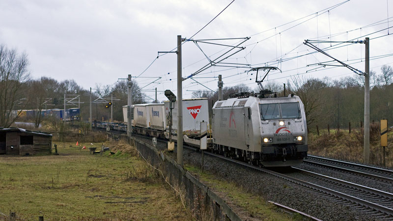 TX Logistik 185 531-1 mit dem KLV-Zug aus dem Süden nach Lübeck-Skandinavienkai. Hamburg-Rahlstedt | Hagenweg, 20. Dezember 2008 |