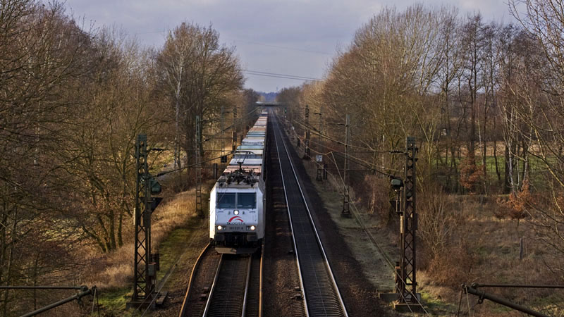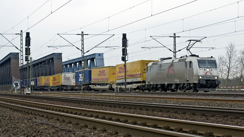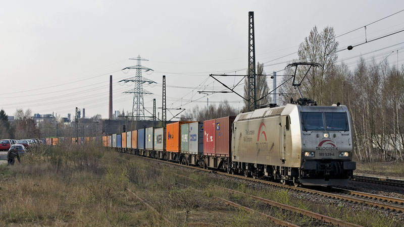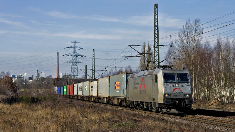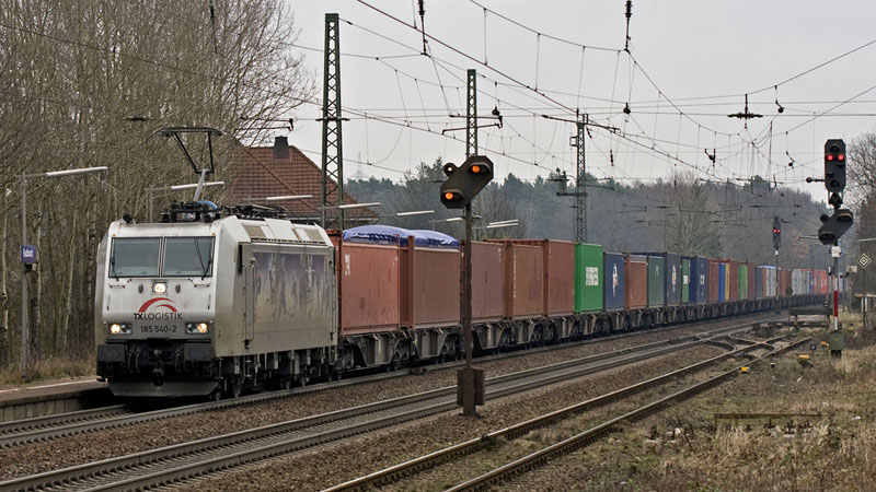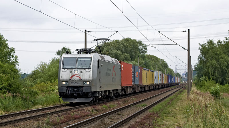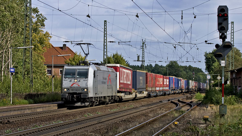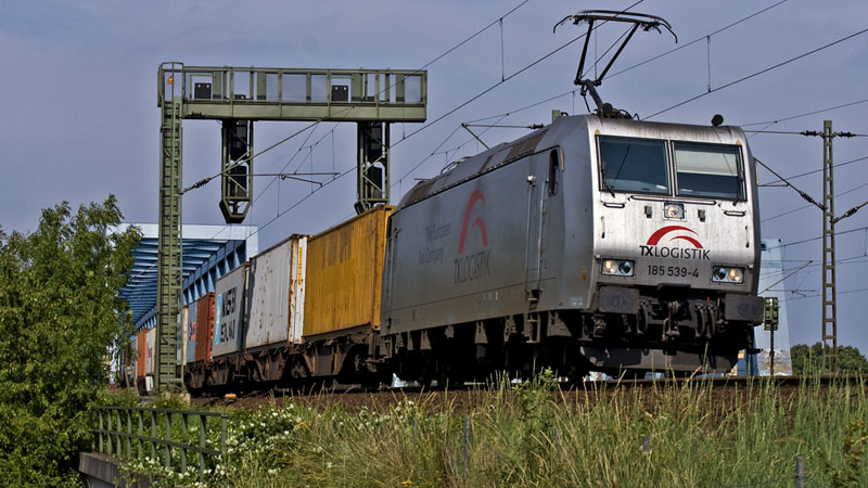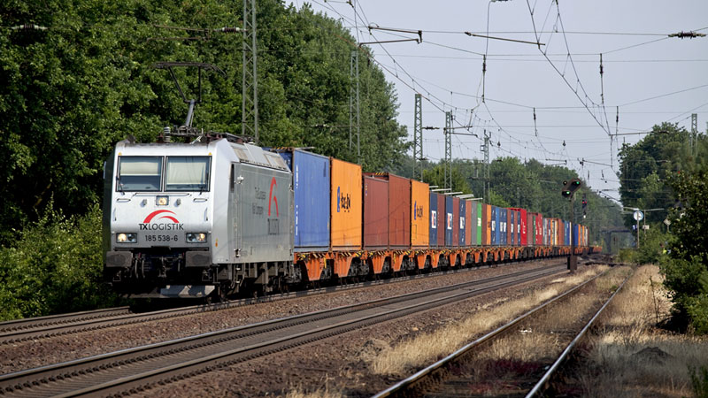 immer noch dreckige 185 538-6 der TX Logistik ist mit einem Containerzug
