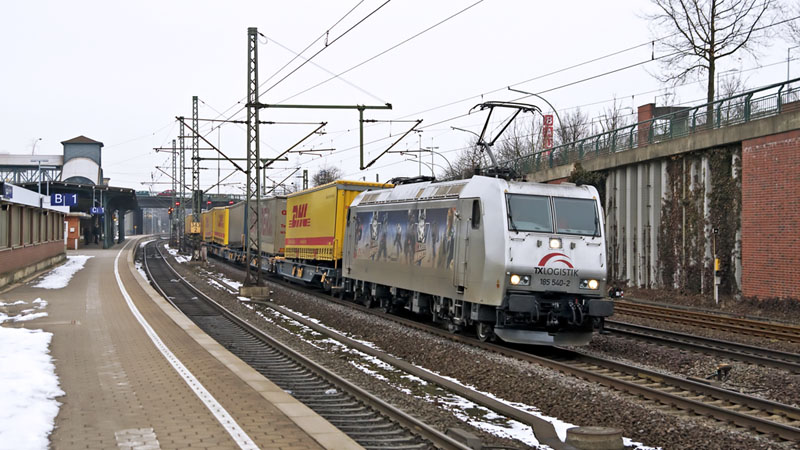 Von Lübeck kam dieser DHL-KLV-Zug mit der "Kassel Huskies" 185 540-2 der TX Logistik. Hamburg-Harburg, 10. März 2010 |